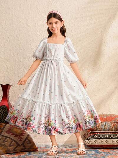 Tween Girl Printed Puff Sleeve Loose Fit Casual Dress With Square Neckline, Woven Fabric-46%