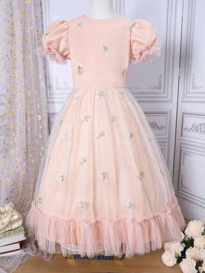 Tween Girls' Lovely Small Flower Embroidery & Mesh Splice Bubble Sleeve Dress-44%