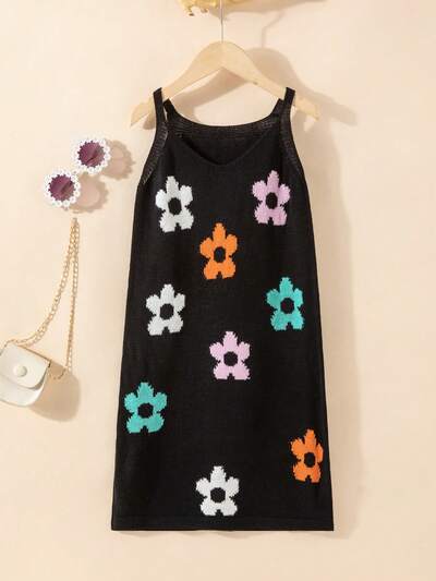 2pcs/Set Cool & Casual Knitted Color-Block Spaghetti Strap Dress For Tween Girls, Spring/Summer