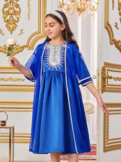2pcs/Set Loose And Cute Round Neck Dress Set For Tween Girls