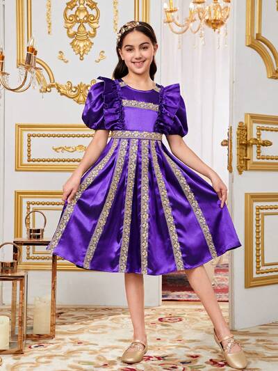Tween Girls' Ribbon Detailed Bubble Sleeves Ruffled Hem Dress-56%