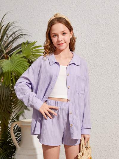 Tween Girls' Casual Peter Pan Collar Short Sleeve Shirt And Ruffle Hem Shorts Pajama Set, Summer