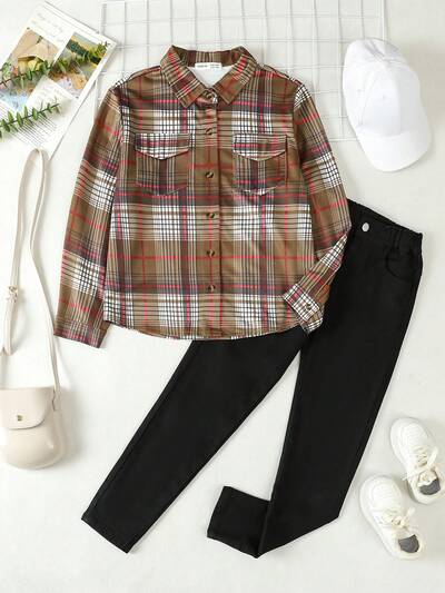 Tween Girls' Plaid Flip Pocket Shirt And Comfortable Casual Pants Two Piece Outfit-65%