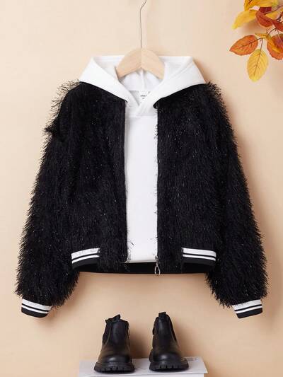 Girls' Loose Fit College Style Lapel Jacket With Fringe Trim,In Fall/Winter-65%