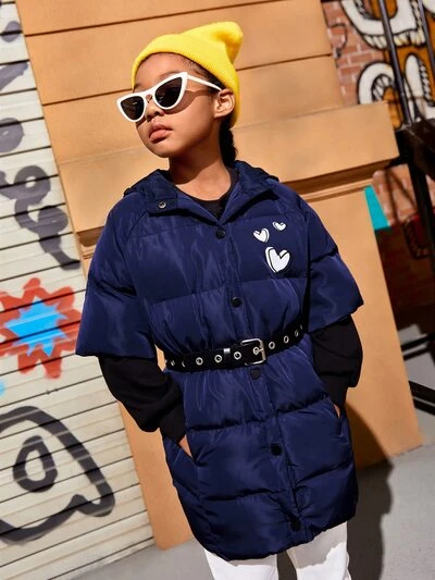 Tween Girls Heart Print Hooded Padded Coat Without Belt-48%
