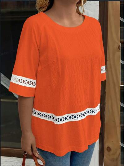 Plus Size Solid Color Round Neck Lace Splice Casual Shirt For Summer