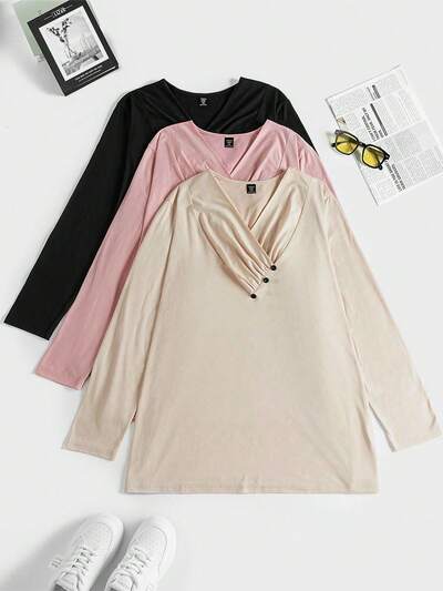 Plus 3pcs Solid Button Detail Tee-30%