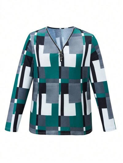 Plus Geo Print Zipper Front Tee Fall Cloth For Women-30%
