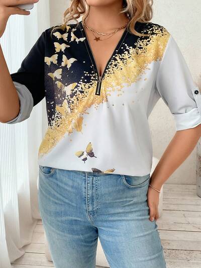 Plus Butterfly Print Rolled Tab Sleeve Half Zip Blouse-30%