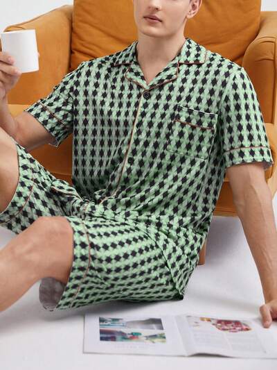 Men's All-Over Printed Lapel Collar Short Sleeve Shirt And Shorts Homewear Set-18%