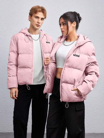 1pc Loose Fit Hooded Padded Coat With Letter Patchwork Detail And Drawstring Hem, For Fall Winter-60%