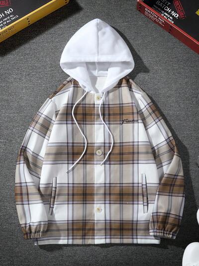 Men Plaid Print Drawstring Hooded Overcoat-60%
