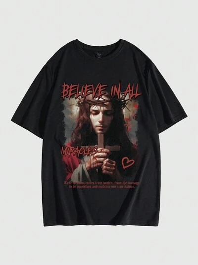 Men's Jesus Graphic Short Sleeve T-Shirt, Retro Street Style