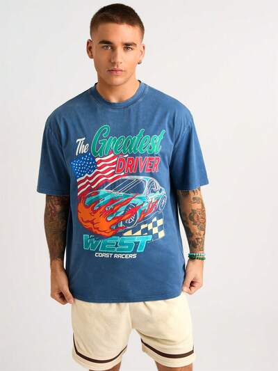Men's Car And Letter Printed T-Shirt In Blue Washed-39%
