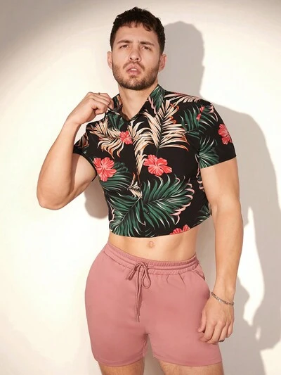 Men Summer Holiday Tropical Plant Printed Short Sleeve Button-Down Shirt And Drawstring Waist Shorts Set-26%