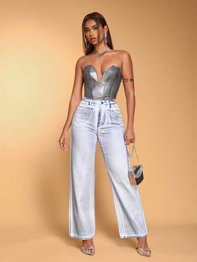 Metallic High Elastic Y2k Valentine's Day Sexy Women Denim Bustier Top-60%