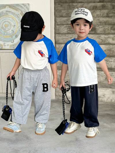 Teen Boy Round Neck Letter Printed Short Sleeve Top And Solid Color Shorts Summer Sportswear