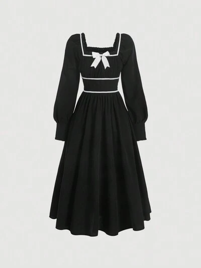 Women's Lantern Sleeves And Bow Embellished Dress-32%