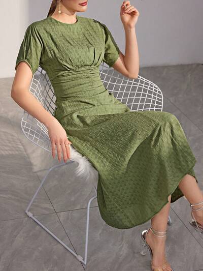 Ladies' Solid Color Texture Pleated Waist Dress-53%