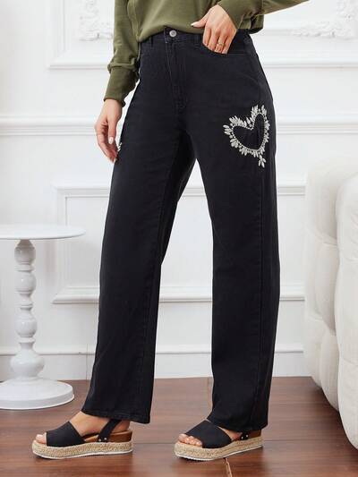 Jeans With Embroidered Heart Decoration And Straight Cut