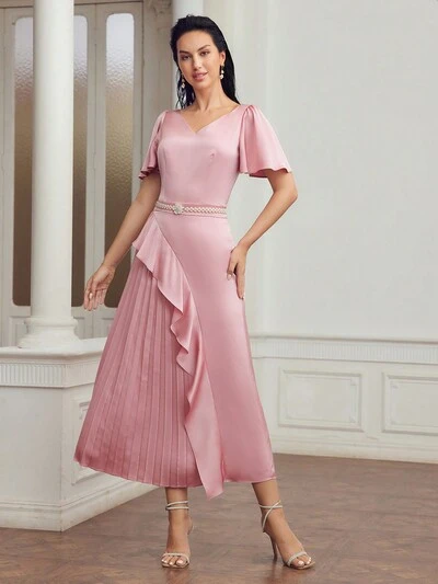V-NECK FLUTTER SLEEVE RUFFLE TRIM PLEATED PANEL DRESS