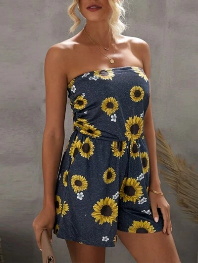 Ladies' Sunflower Printed Strapless Jumpsuit For Vacation And Leisure