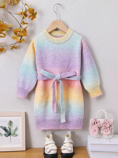 Baby Girl Ombre Lantern Sleeve Belted Sweater Dress-60%