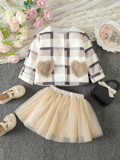 Baby Girls' Elegant Vintage Plaid Coat And Mesh Skirt Set-60%