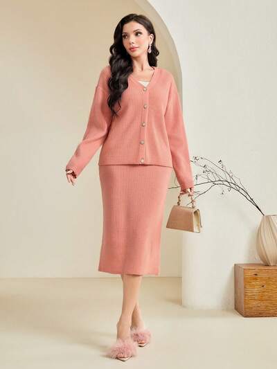 Women'S Solid Color Drop Shoulder Sweater & Skirt Set-60%