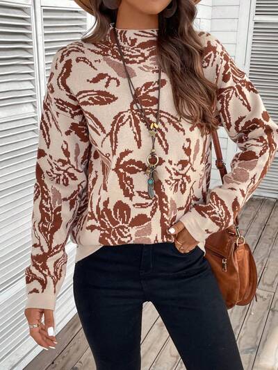 Floral Pattern Mock Neck Drop Shoulder Sweater-60%