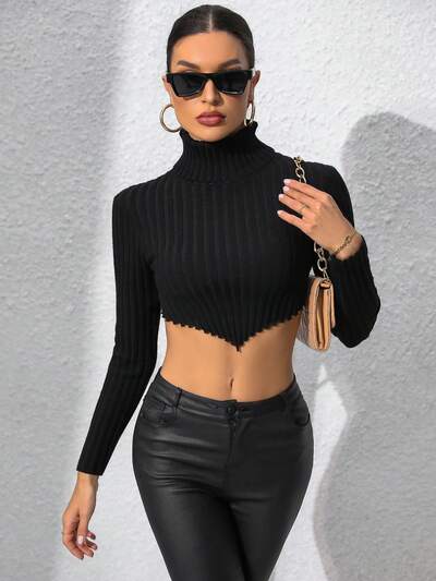 High Neck Asymmetrical Hem Crop Knit Pullover Fall Winter Sweater-65%