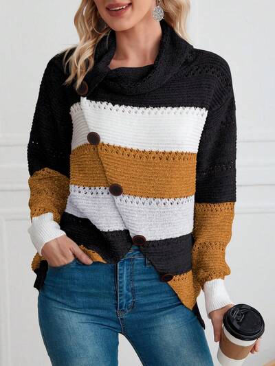 Colorblock Cowl Neck Button Detail Asymmetrical Hem Knit Pullover Fall Winter Sweater-60%