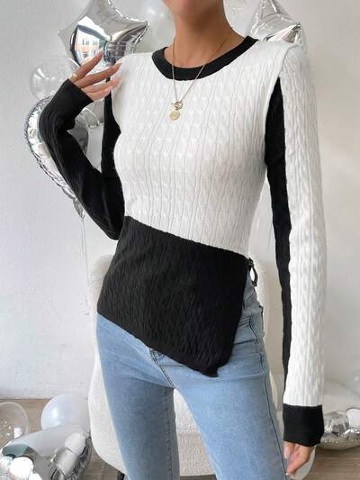Two Tone Asymmetrical Split Hem Cable Knit Pullover Fall Winter Sweater-58%