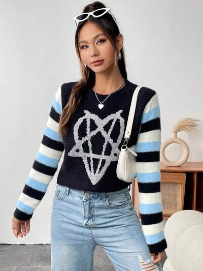 Striped & Heart Pattern Colorblock Knit Pullover Fall Winter Sweater-65%