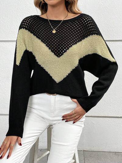 Colorblock Chevron Pattern Pointelle Knit Drop Shoulder Sweater-60%