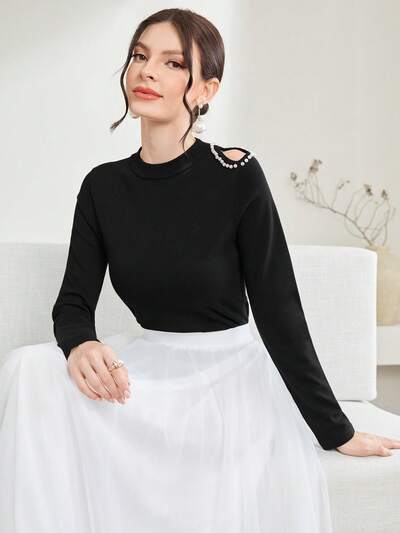 Faux Pearls Beaded Cut Out Shoulder Knit Pullover Fall Winter Sweater-60%