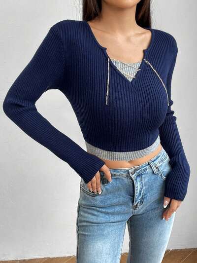 Notched Neck 2 In 1 Crop Knit Pullover Fall Winter Sweater-60%