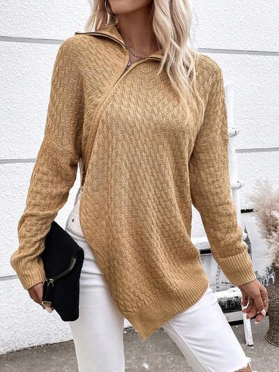 Solid Zip Up Drop Shoulder Asymmetrical Hem Knit Pullover Fall Winter Sweater-60%