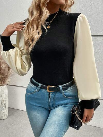 Two Tone Mock Neck Lantern Sleeve Knit Pullover Fall Winter Sweater-60%