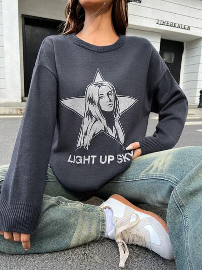 Figure & Letter Pattern Drop Shoulder Sweater-35%