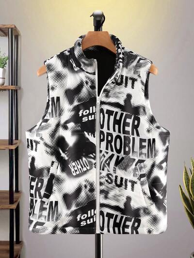 Loose Fit Men's Letter Graphic Zip Up Sleeveless Winter Jacket-60%