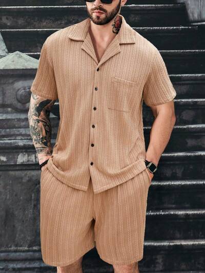 Men Plus Size Solid Color Casual Daily Spring Summer Short Sleeve Shirt And Shorts Set-25%