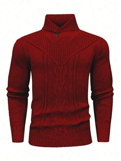 Men's Solid Color Stand Collar Button Detail Sweater, Men Red Sweater, Men Turtleneck Sweater, Men Knitted Sweater, Men Cable Knit Sweater, Men Winter Sweater, For Fall, Long Sleeve Top-26%