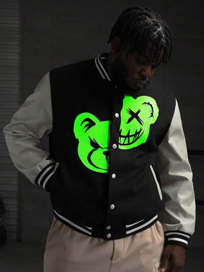 Men Plus Reflective Expression Print Striped Trim Colorblock Varsity Jacket, For Fall Winter-60%