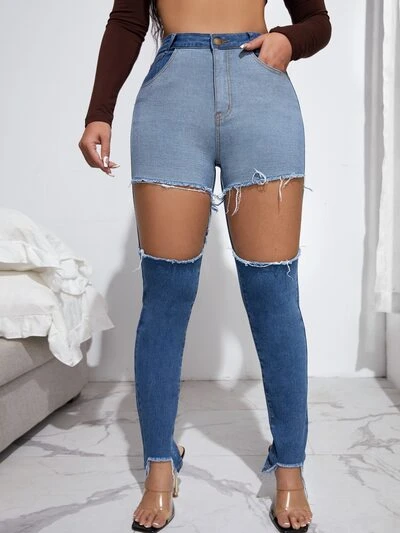 High Waisted Colorblock Cutout Raw Hem Skinny Jeans-65%