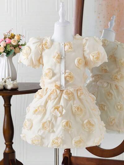 Young Girl 2pcs Flower Puff Sleeve Top And Skirt, Stylish Princess Dress For Summer-55%