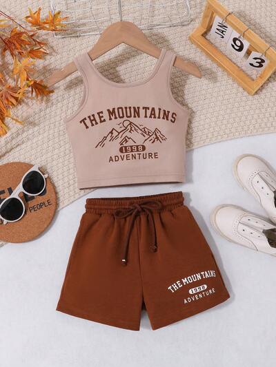 Young Girl Letter Printed Round Neck Summer Top With Drawstring Shorts-60%