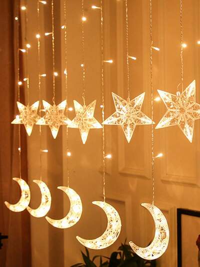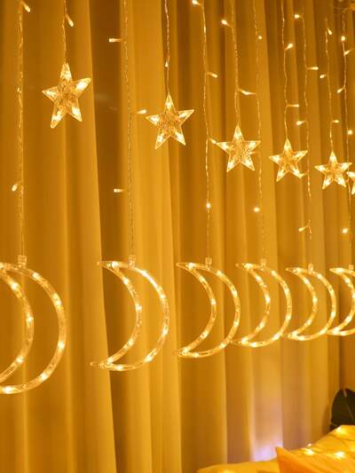 1pc 115 LED 2.5m*0.8m Hollow Acrylic Star & Moon Curtain Lights, 2m Power Cord, Battery Operated, Home Decor Hollow Star & Moon Curtain LED Lights, Suitable For Ramadan, Festivals, Camping, Office Decor