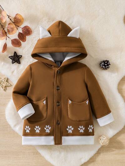Baby Girl Embroidery Paw Pattern 3D Ear Design Hooded Teddy Lined Overcoat-65%