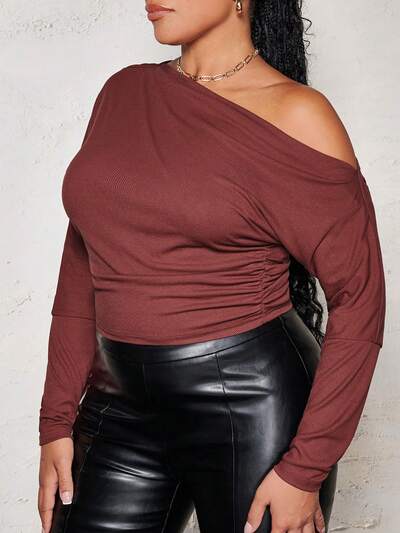 Plus Size Burgundy Asymmetrical Neck Thread Knit Top With Waist Ruched Design, Perfect For Christmas Party And New Year's Eve, Winter-65%